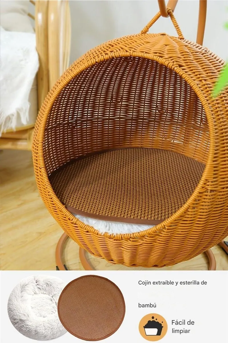 Incluye un cojín suave y cómodo, que podés lavar a máquina para mantenerlo siempre limpio. La cesta de ratán y el soporte metálico se limpian fácilmente con un paño húmedo.