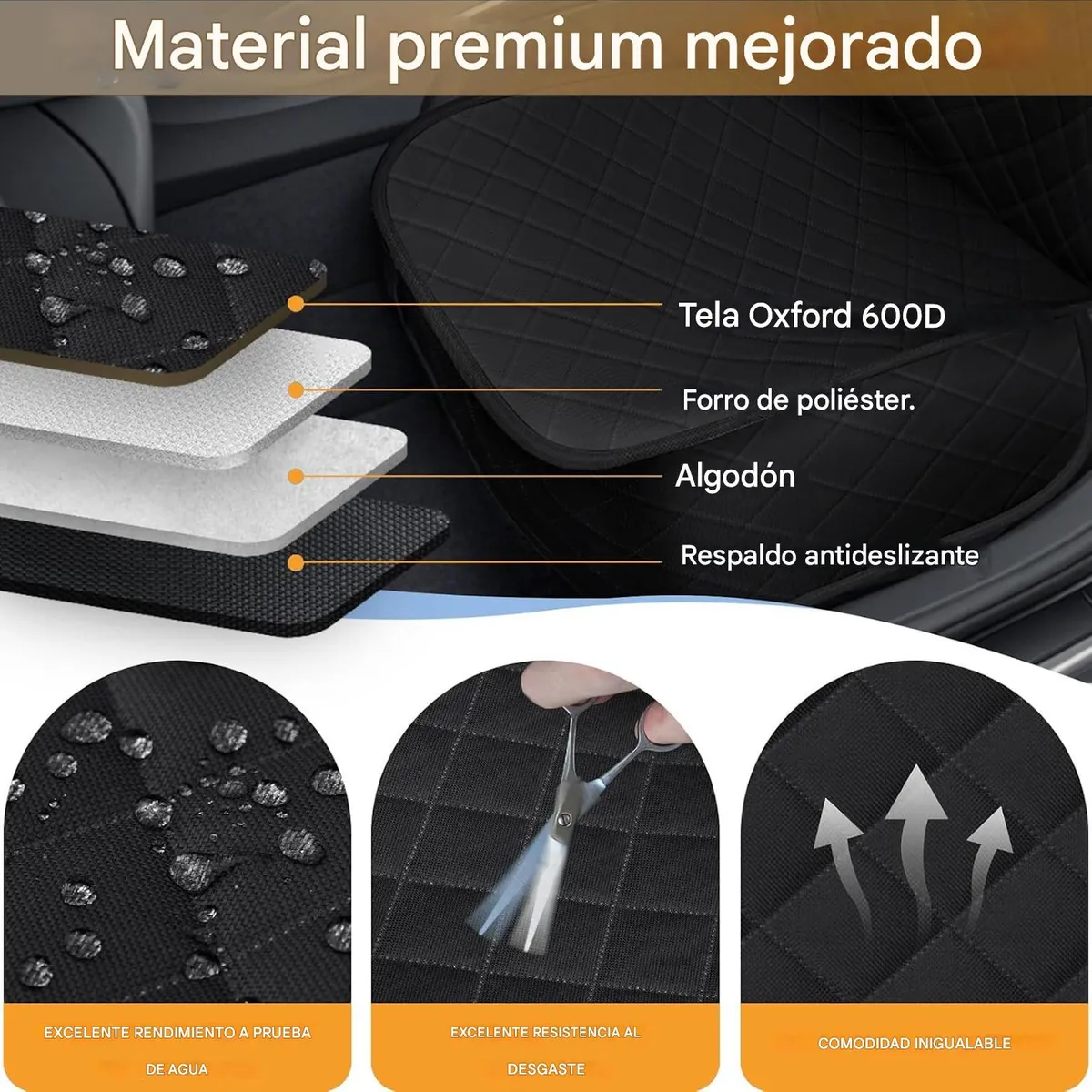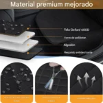 Fabricada con material Oxford 600D, esta funda combina durabilidad y comodidad. Su superficie suave cuida las patas de tu mascota y proporciona un espacio confortable para descansar durante el trayecto. El reverso antideslizante evita movimientos indeseados, incluso cuando tu perro se muestra inquieto. Además, es totalmente impermeable, ideal para proteger tu coche de humedad, barro y suciedad.