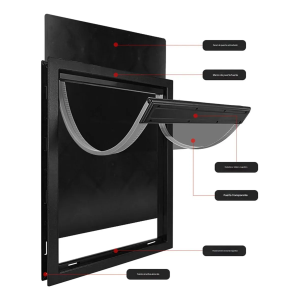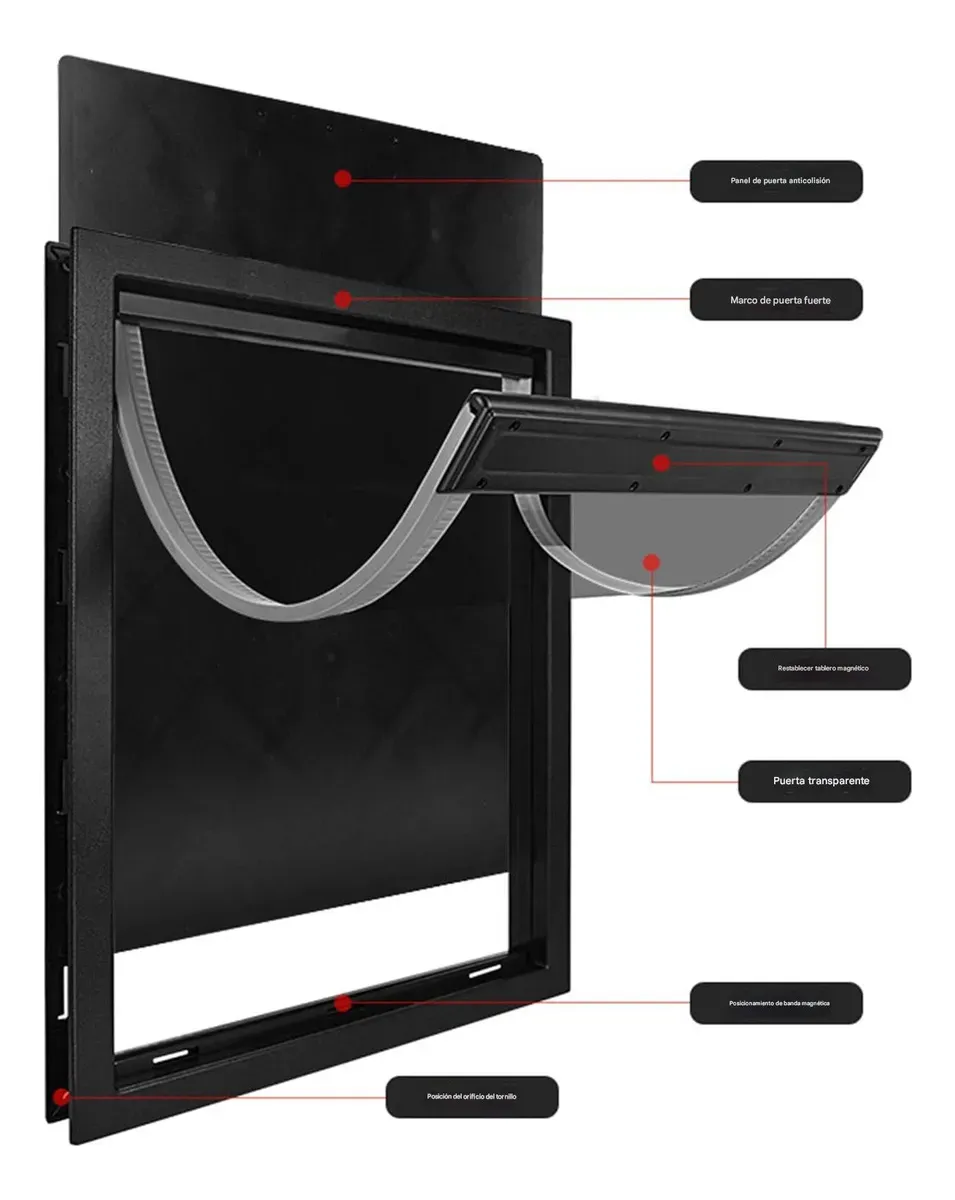 Puerta para mascotas diseñada para ofrecer seguridad, comodidad y un control total del acceso. Su sistema de ajuste del deflector permite que el perro entre y salga libremente por ambos lados. Cuando se desea limitar la salida, el deflector trasero de bloqueo rápido se inserta fácilmente, generando un cierre seguro y práctico para gestionar el movimiento de la mascota según las necesidades del hogar. La ranura del deflector, integrada en la parte superior del marco, evita que la placa salga de su posición y reduce el impacto ante posibles golpes de la mascota. Gracias a su diseño reforzado, el deflector ofrece mayor estabilidad y resistencia durante el uso diario. Equipada con una placa de reinicio magnética, la puerta garantiza que la solapa vuelva de inmediato a su posición original después de cada movimiento. El imán asegura un cierre constante, impidiendo el paso de personas u otros animales no deseados y manteniendo la zona controlada. El marco está fabricado en ABS de alta calidad, un material sintético reconocido por su resistencia, dureza y estabilidad química. Su superficie lisa y sólida asegura una larga vida útil incluso en entornos de uso intensivo. La aleta de entrada y salida está elaborada en PVC transparente de alta resistencia, permitiendo una visibilidad clara sin comprometer la seguridad. La versión en puerta negra ofrece un acabado gris claro y translúcido, mientras que la versión en puerta blanca se presenta completamente transparente. Medidas exteriores: 50 cm de alto x 38 cm de largo x 5,8 cm de ancho. Medidas interiores: 42 cm de alto x 33 cm de largo.