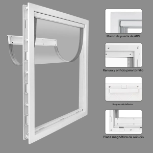 Puerta para mascotas diseñada para ofrecer seguridad, comodidad y un control total del acceso. Su sistema de ajuste del deflector permite que el perro entre y salga libremente por ambos lados. Cuando se desea limitar la salida, el deflector trasero de bloqueo rápido se inserta fácilmente, generando un cierre seguro y práctico para gestionar el movimiento de la mascota según las necesidades del hogar. La ranura del deflector, integrada en la parte superior del marco, evita que la placa salga de su posición y reduce el impacto ante posibles golpes de la mascota. Gracias a su diseño reforzado, el deflector ofrece mayor estabilidad y resistencia durante el uso diario. Equipada con una placa de reinicio magnética, la puerta garantiza que la solapa vuelva de inmediato a su posición original después de cada movimiento. El imán asegura un cierre constante, impidiendo el paso de personas u otros animales no deseados y manteniendo la zona controlada. El marco está fabricado en ABS de alta calidad, un material sintético reconocido por su resistencia, dureza y estabilidad química. Su superficie lisa y sólida asegura una larga vida útil incluso en entornos de uso intensivo. La aleta de entrada y salida está elaborada en PVC transparente de alta resistencia, permitiendo una visibilidad clara sin comprometer la seguridad. La versión en puerta negra ofrece un acabado gris claro y translúcido, mientras que la versión en puerta blanca se presenta completamente transparente. Medidas exteriores: 50 cm de alto x 38 cm de largo x 5,8 cm de ancho. Medidas interiores: 42 cm de alto x 33 cm de largo.