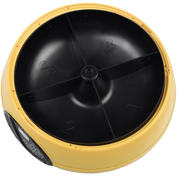 El plato, que contiene cuatro grandes bandejas de alimentos, permanecerá abierto hasta el próximo tiempo de alimentación programado. El alimentador viene armado, sin embargo puede ser desarmado para su limpieza. Funciona con 4 unidades de baterías C (no incluidas)